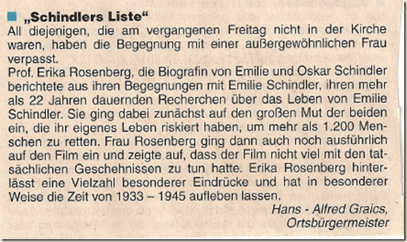Was vor drei Jahren als eine Idee meinerseits in einem Regensburger Café am Dom an einem sehr winterlichen Tag im Dezember entstanden ist, wurde mit der Zeit allmählich wahr. Nämlich eine Ausstellung aus dem Schindler Nachlass in 33 Tafeln mit der FES Regensburg zu konzipieren. In Regensburg haben die Schindlers von Juli 1945 bis Oktober 1949 gelebt. Auf diese Straßen sind nach dem Krieg die “Unbesungenen” Helden” Emilie und Oskar gegangen. In manchen Läden haben sie sogar ihre Besorgungen gemacht. In die Adler Apotheke, die heute noch an der Ecke Am Watmarkt steht., sind die Schindlers reingegangen. Auch in einem Hut Laden hat Emilie einen schönen Hut besorgt. . . Viele Erinnerungen an ihre Berichte gehen mir heute durch den Kopf. Diese Stadt habe ich in mein Herz eingeschlossen. Daher habe ich diese riesige Ausstellung hier geplant. Jedoch ist sie immer noch nicht fertig, obwohl wir uns immer mehr bemühen. Es dauert schon gar nicht mehr sooooooo lange.