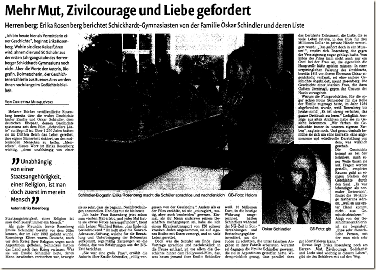 Ich führte die jungen Menschen durch die Ausstellung. Gegen 13 Uhr kam die Presse. Der junge und nette Journalist stellte den Schülern und mir Fragen. Es war wirklich ein sehr interessanter Vormittag. Am Abend halte ich in der VHS einen Vortrag über Buenos Aires, Stadt, wo sich die Täter und Opfer nach dem Zweiten Weltkrieg “unwillkürlich” trafen. . .