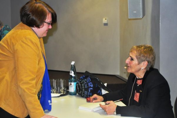 Auch KDFB- Vorsitzende Desirée Aufderheide ist das Buch von Prof. Rosenberg sehr ans Herz gewachsen. Sie erlebte Erika Rosenberg in Augsburg und ließ sich persönlich ihr Buch von ihr signieren – so wie viele andere Teilnehmer/innen auch. Herzlich dankte sie ihr im Namen des KDFB Diözesanverbands Augsburg für die gelungene Vortragsreise, die in Fuchstal-Leeder, Benningen, Senden, Steingaden, Bobingen, Augsburg und Kempten Station machte.